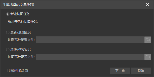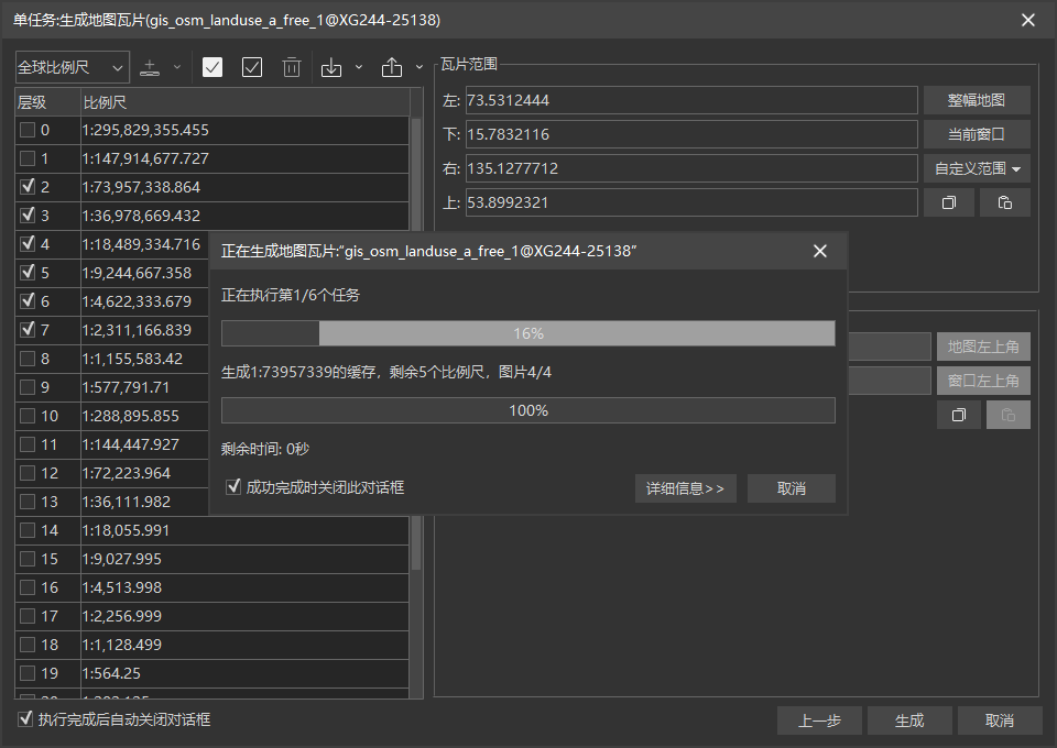 右键点击已保存的地图,在弹出的菜单中选择“生成地图瓦片(单任务)”。可修改增加比例尺,分辨率参数,设置存储目录,生成栅格瓦片源。