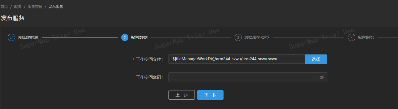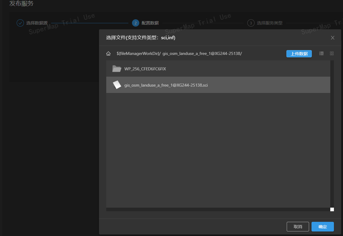 点击“上传数据”,上传待发布的工作空间zip包,在列表中选择对应的.sxwu文件。