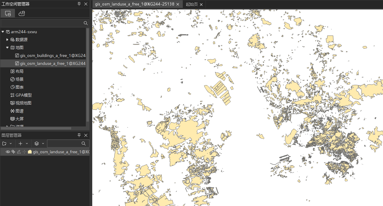 将需要发布地图服务的数据集gis_osm_landuse_a_free加载到地图窗口中。