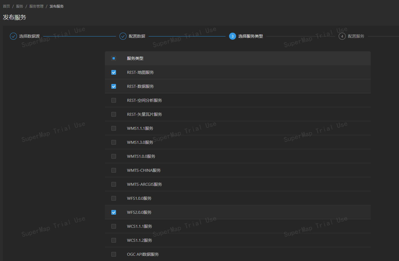 根据需求选择要发布的服务类型,例如:REST-地图服务,REST-数据服务,WFS2.0.0服务等。根据提示完成必要的参数设置,然后发布。